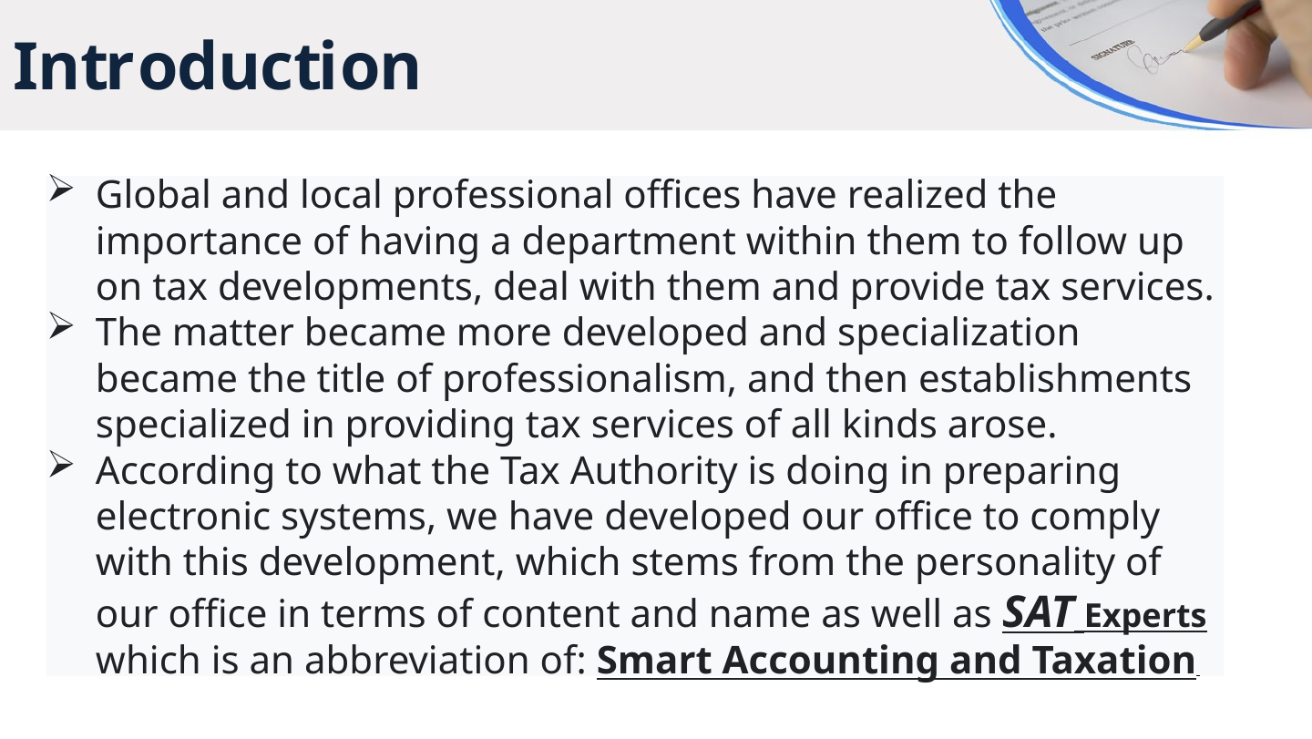 SAT Experts (Smart Accounting and Taxation) was developed to align with the Tax Authority’s transition toward electronic systems, providing specialized tax services supported by experienced professionals.